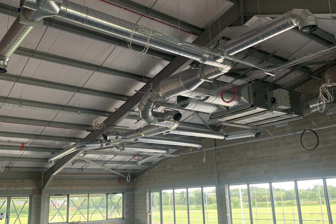 - Air Handling Unit: A central air handling unit was installed in the main bar/function area to provide heat-recovered fresh air on a trickle. It was connected to a CO2 monitor, boosting operation when CO2 levels increased. In-line fans with barrel-type grilles were installed in the toilets and changing rooms to facilitate stale air extraction.